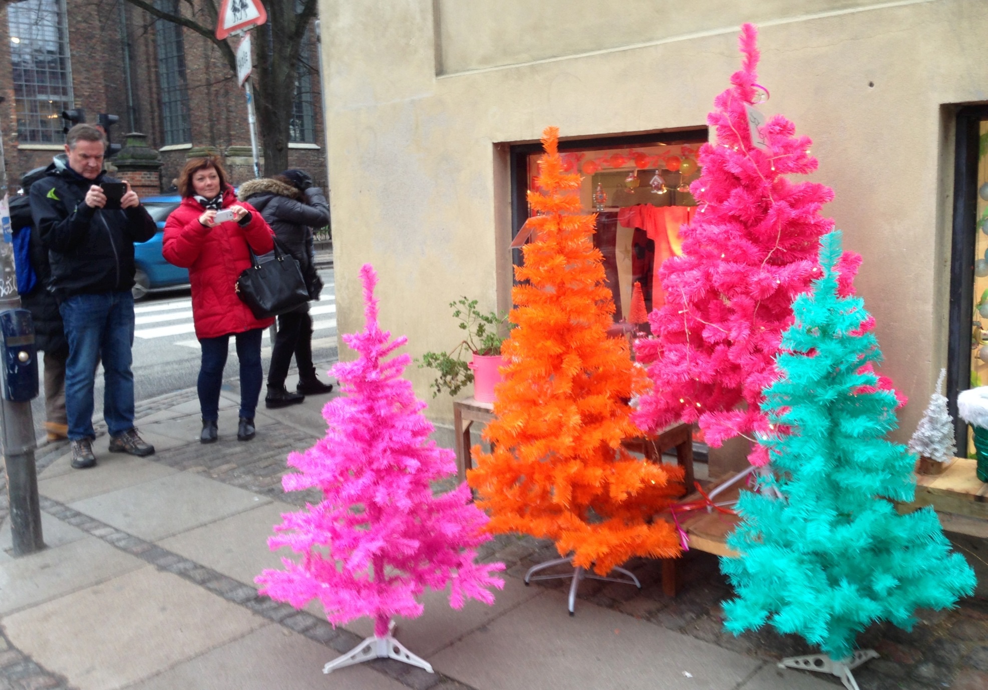 Hvem siger træet skal være grønt? Hos Pang på hjørnet af Skt. Annæ Gade er der knald på farverne. ‘Hold kæft, hvor er de grimme!’ mente en forbipasserende herre. Men andre er uenige, træerne er allerede revet væk – det forlyder dog, at en ny sending af de lyserøde er på vej fra Tyskland.