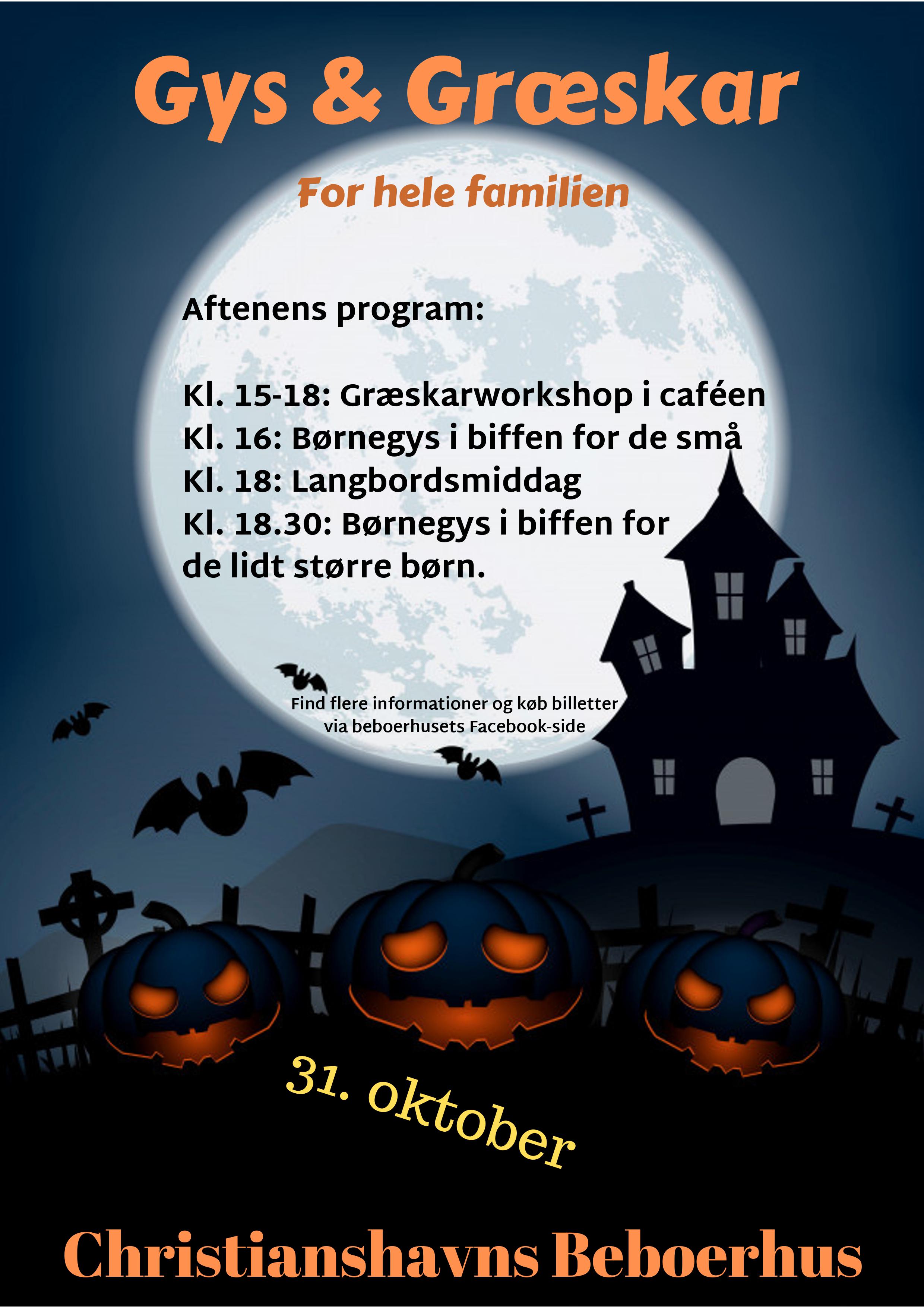 Kl. 15-18: Græskarworkshop i cafeen – Vi har græskar, skeer og knive. Kl. 16: Børnefilm i biffen for de små Kl. 18: Langbordsmiddag til hele familien, bestående af bloddryppende zombie mos og grillede øgleknogler ? (græskarmos med rødbedesaft, chips og ovnstegte kyllingelår) Kl. 18.30: Børnefilm i biffen for de lidt større børn.