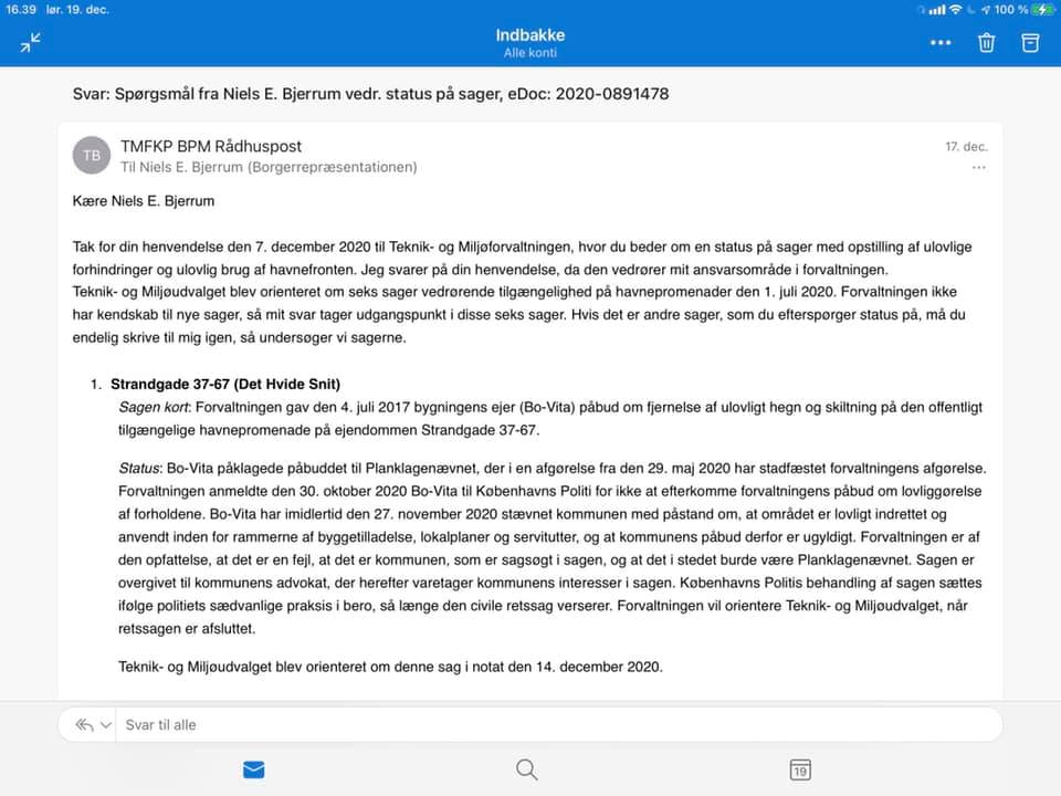 Et eksempel på det er den almene boligforening Bo-Vita på Strandgade, hvor boligforeningens formand ikke ønsker at københavnerne kan cykle forbi hans luksus lejlighed ved havnefronten – og derfor har han opsat hegn som forhindre den frie og uhindret passage. Både kommunen og Planklagenævnet har fastslået at hegnet er ulovligt opsat, men formanden bliver ved med at trække sagen i langdrag – nu ved at anlægge en sag imod kommunen. Imens får hegnet lov til at blive stående – og det er jeg hamrende harm over! Senest status i sagen kan læses i dokumentet i opslaget her.