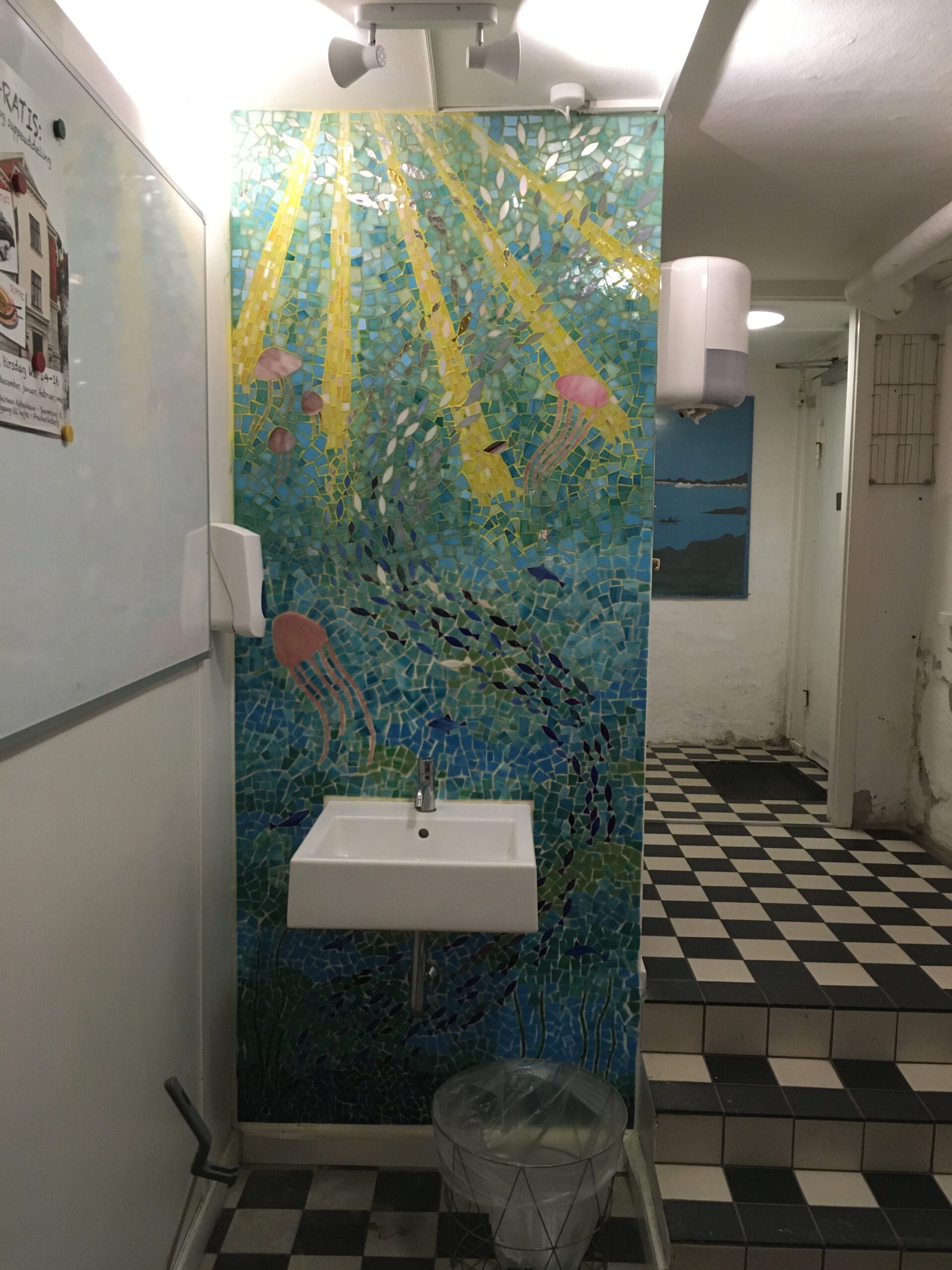 Tak til Pia Skak Mortensen og Social- og Ældreministeriet for at give de mennesker, der til dagligt besøger Fedtekælderen noget at glæde sig over. En af Fedtekælderens gæster sagde da han så mosaikken: ‘ Når jeg ser fiskestimen der svømmer mod lyset, giver det mig håb og fornyet energi.