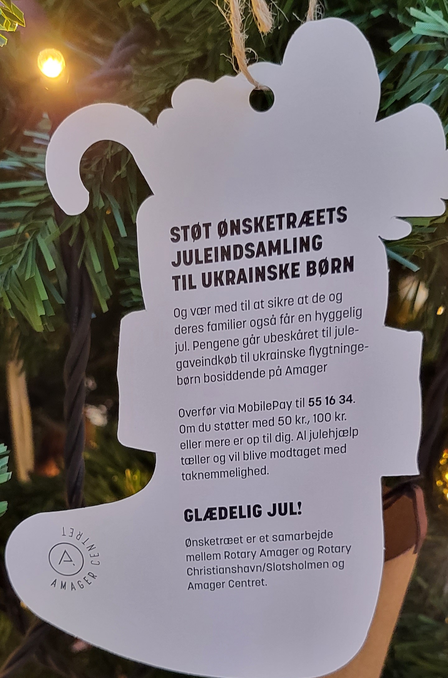 Som så mange andre, har Christianshavn og Amager Rotary et Ønsketræ i et af landets indkøbscentre. Men som de eneste, stopper vi ikke, når ønskerne er opfyldt. Mange vil gerne støtte, så derfor har vi en MobilePay-indsamling, hvor midlerne i år går til en julefest for og gaver til ukrainske børn. Tidlige har vi støttet grønlandske børn og Joannahuset på Christianshavn. I år glæder vi os til at “blive en del af festen” når vi den 17. dec. i Skelgårdskirken stiller op med leg, gaver og julegodter og gør en lille forskel for de børn, der er blevet en del af krigen.