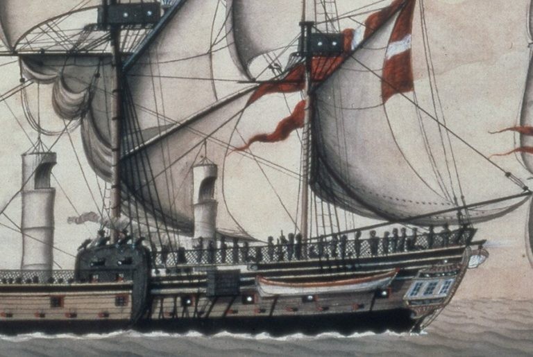 Nok ikke alle ved, at netop Christianshavn i 1700-tallet var hjemsted for handlen med slaver og slaveproduceret sukker og for byggeriet af datidens slaveskibe som her på billedet ”Fredensborg” med de sorte skikkelser på dækket på vej til slaveøerne på den anden side af Atlanten.