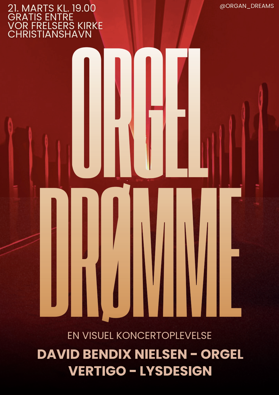 Orgeldrømme er en unik koncertoplevelse, hvor orgelmusik, lysdesign og arkitektur smelter sammen til et medrivende audiovisuelt univers. Oplev klassiske mesterværker af J.S. Bach og Louis Vierne samt de anerkendte minimalister Philip Glass og Arvo Pärt. Musikken kommer til live i mødet med det prisvindende kunstnerkollektiv Vertigos innovative lysinstallationer og laserprojektioner.